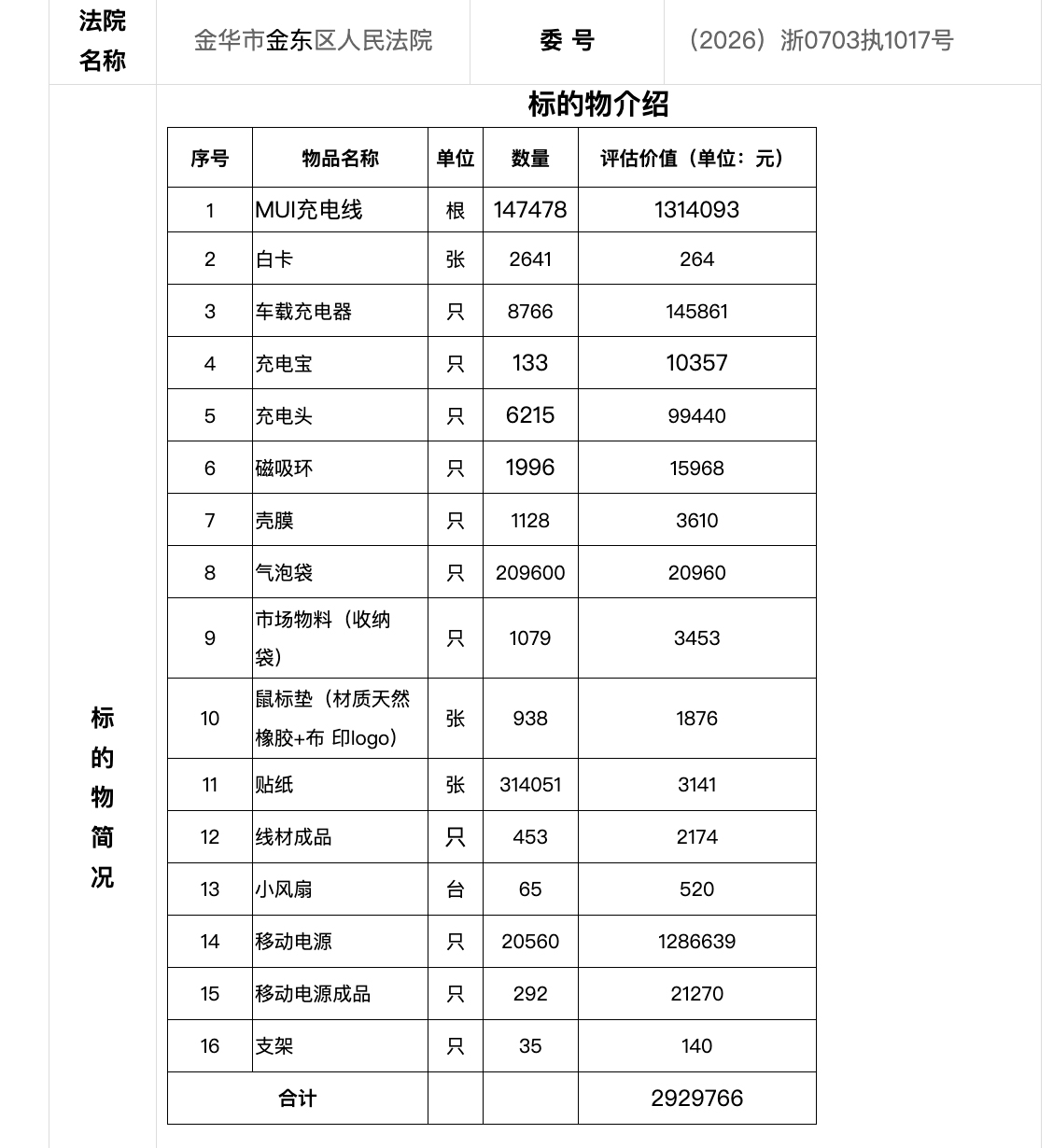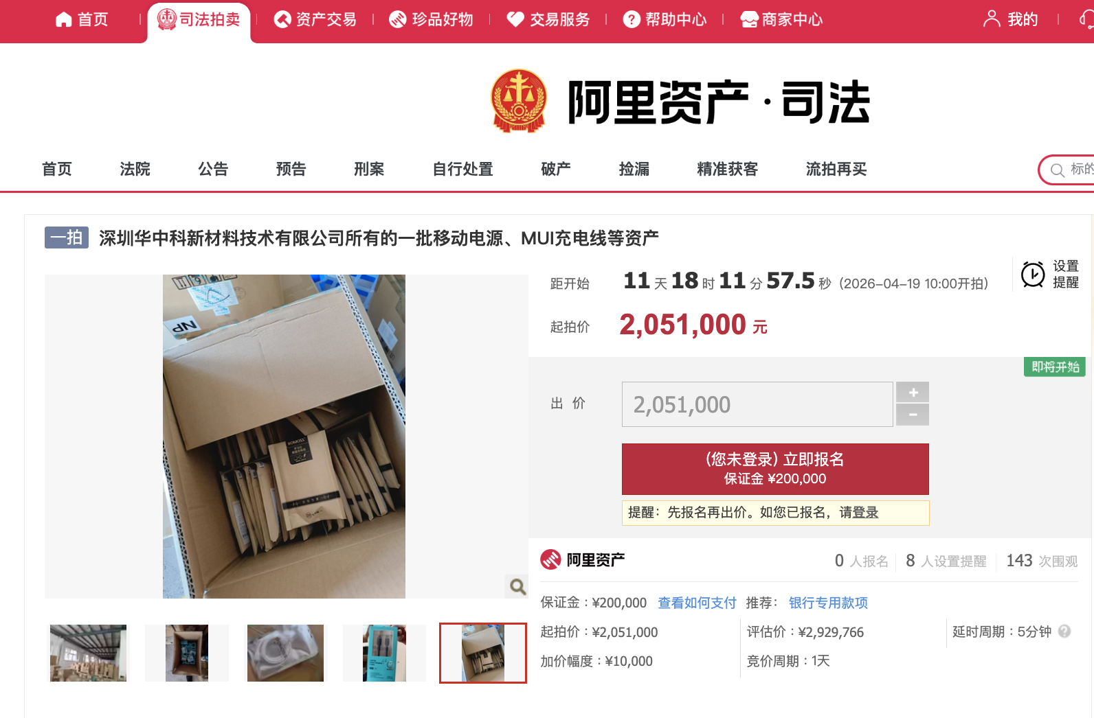 今日深圳华中科新质料技能无限公司全部的1批物业将被法令拍售,包含:20560只挪动电源、147478根MUI充电线等,起拍价205.1万元,评价价约292.98万元,拍售光阴为4月19日10时至4月20日10时。